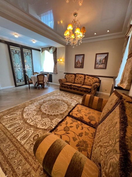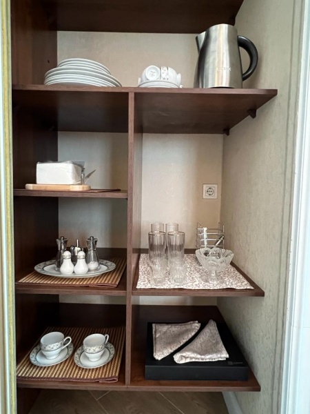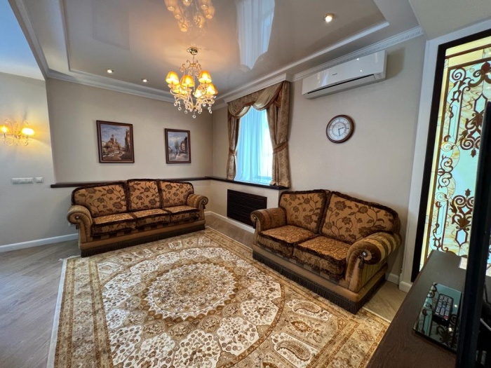 Гостинная: В зоне отдыха имеется 2 дивана, телевизор с плоским экраном, DVD плеер, кондиционер, интернет. В столовой зоне расположен обеденный стол на 4 персоны (в номере имеется необходимая посуда, столовые приборы, чайник, холодильник)