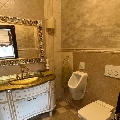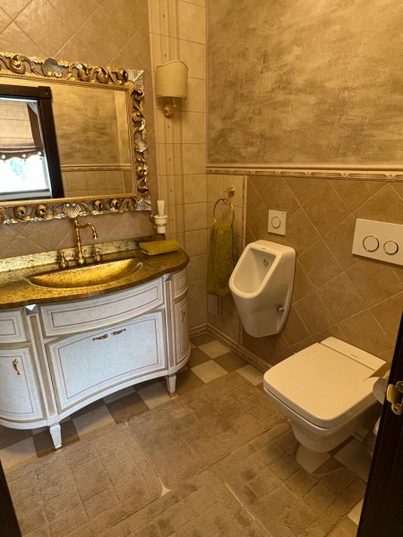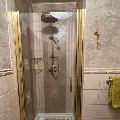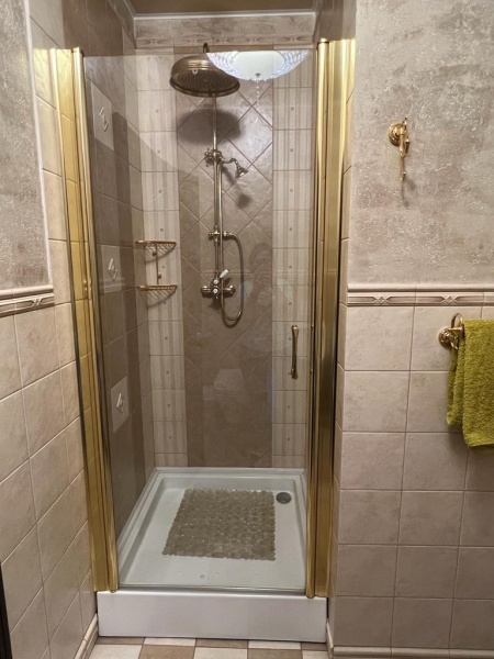 Ванная комната (туалет, душевая кабина, халат, тапочки, полотенца, фен).